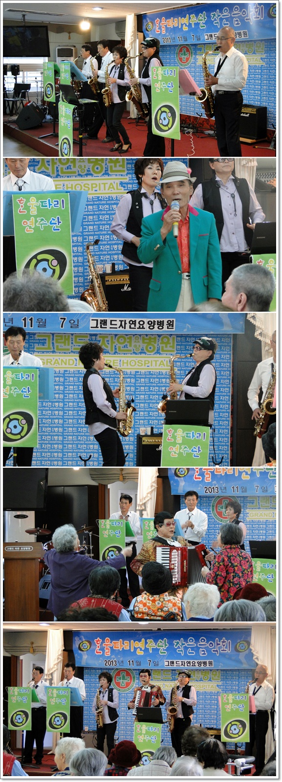지난 11월 7일 한울타리 연주단의 공연이 그랜드자연요양병원 5층 이벤트홀에서 열렸다. 매월 한차례 문화 봉사 활동을 펼치고 있는 한울타리 연주단의 이날 공연은 가수 최명운의 흥겨운 옛가요를 시작으로 가수 오래, 가수 임대윤의 메들리로 이어졌다. 특히, 가수 임대윤의 아코디언 연주는 어르신들을 추억속으로 함께 하기에 좋은 시간이 되었다.