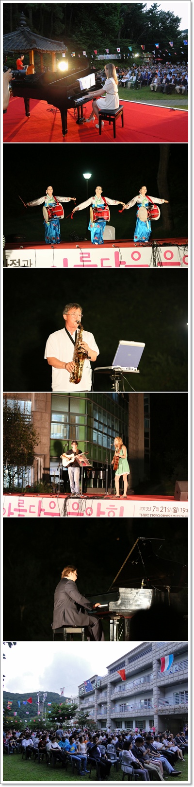 - Evgeny Izotov (현, 러시아 상트페테르부르그 국립음악원 교수, 신라대학교 예술대학 음 악학과 교수), Interest (마이클 지노 : 동의대학교 교수, 바이올렛 리 : 동명대학교 교수)등 출연. -7월 21일 19시 부산 그랜드자연요양병원 파이에온 잔디광장 부산 그랜드자연요양병원(병원장 나용승)은 2013년 7월 21일 그랜드자연요양병원 파이에온 잔디광장에서 아시아 공동체 학교를 비롯한 다문화 가족들, 지역 내 취약 계층의 가족들, 그랜드자연요양병원 환우 및 가족들을 초청하여 아름다운 음악회를 열었다. 부산 남구 문화원이 주최하고 그랜드자연요양병원이 주관, 부산 남구청이 후원하는 이번 아름다운 음악회는 t-broad에서 공연 실황을 녹화해 방송할 예정이며 현장에서 모금한 모금액은 다문화 가족 어린이들을 위하여 기증되었다. 나용승 병원장은 “연주자들 모두 이번 공연의 취지에 공감해 바쁜 일정 속에서도 흔쾌히 출연을 결정했다.”며 “이번 공연은 국제적인 기부 문화 정착과 나눔 문화 확산이 기대된다.”고 설명했다. 세계적인 피아니스트 Evgeny Izotov 와 어쿠스틱 듀오 Interest의 연주를 비롯해 부경대학교 KOICA 대학원생들의 봉사 등 다양한 프로그램으로 열린 이번 공연은 지역 내 자선 문화 공연으로 자리매김하고 지속적인 사회공헌 프로그램을 위한 계기가 되었다. 그랜드자연요양병원은 노년의 우아한 삶을 유지하고 품격 높은 문화 속에서 건강관리가 자연스럽게 이루어지는 문화가 있는 요양병원이 되기 위해 노력하고 있다.