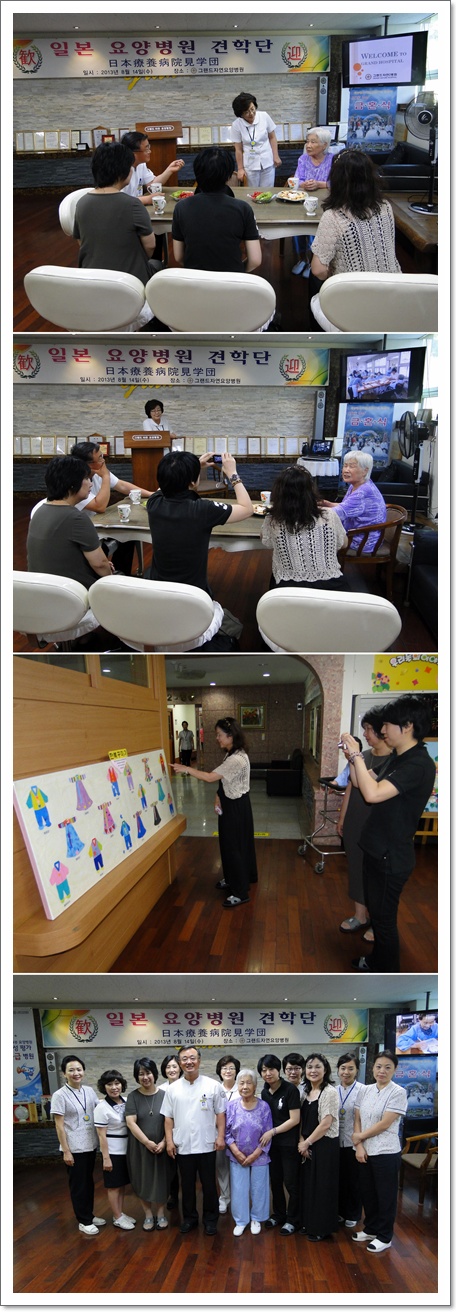지난 8월 14일 일본 요양병원 견학단이 부산 그랜드자연요양병원을 찾았다. 견학단은 그랜드자연요양병원의 깨끗하고 단아한 시설과 직원들의 활기차고 가족적인 모습이 환자들에게 큰 힘이 되는것 같다며 특히 하늘이 보이는 재활센터는 그랜드자연요양병원의 자랑인듯하다고 했다. 병원내부를 견학한뒤 그랜드자연요양병원의 자원봉사 프로그램과 전문 문화 프로그램에 많은 관심을 보였다.