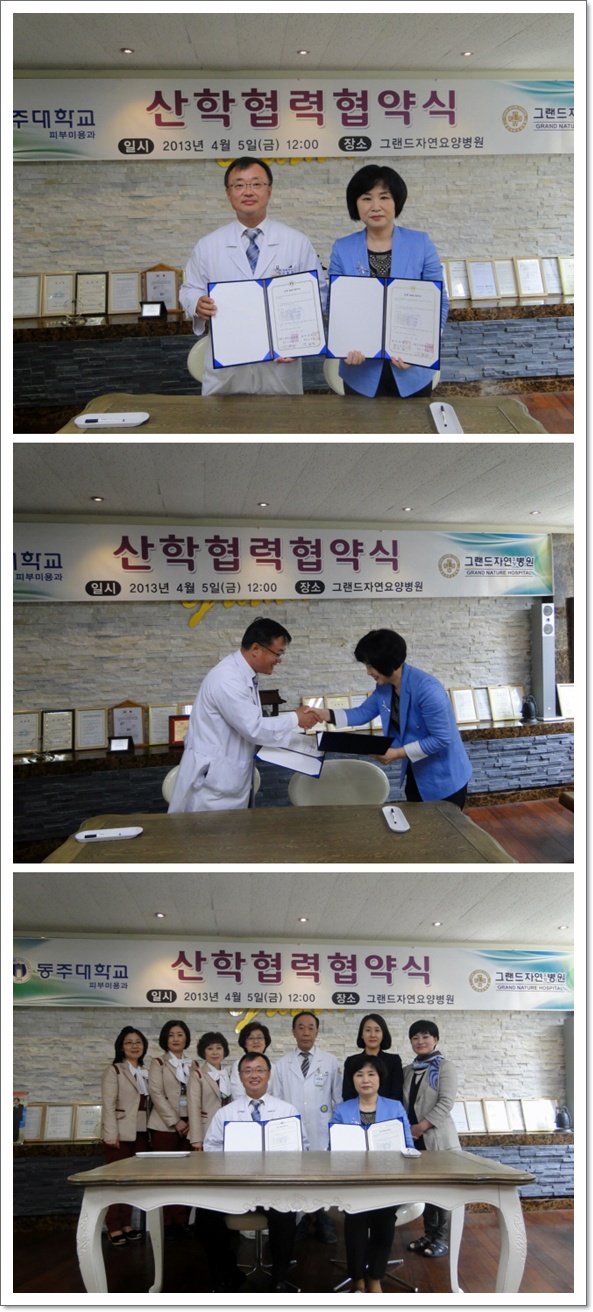 지난 4월 5일 그랜드자연요양병원(병원장 나용승)은 35년 전통의 대학, 미래를 선도하는 동주대학교와 산학 협력 협약식을 가졌다. 그랜드자연요양병원 나용승 병원장은 동주대학교와 함께 현장실습에 관한 지원 협력 및 산학 협동 공동 연구 과제에 관한 상호 협력 등을 통해 지역 발전에 기여할 수 있는 좋은 만남이 되었으면 한다고 강조하였다. 이에 동주대학교 피부 미용 전공장 김희진 교수는 보다 적극적인 소통을 통해 활발한 교류가 만들어 졌으면 한다고 말했다. 이날 참석자로 병원측에서는 나용승 병원장, 김용철 부원장, 석송숙 간호부장, 홍순애 원무과장, 유인주 행정과장, 이지영 기획홍보팀장이, 대학측에서는 김희진교수, 윤석나교수, 장미엽교수가 각각 참석하였다.
