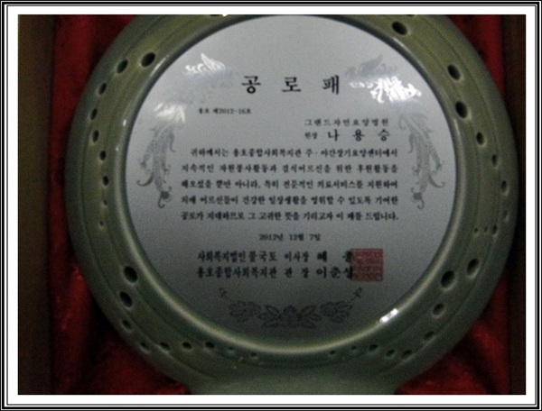 2012년 12월 7일 용호 종합 사회 복지관에서 본원의 나용승 병원장님께 지속적인 자원봉사활동과 결식 어르신을 위한 후원활동,전문적인 의료서비스를 지원하여 치매 어르신들이 건강한 일상 생활을 영위할 수 있도록 기여하심에 공로패를 수여하였다.