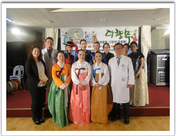 그랜드자연요양병원은 오는 5.8일 어버이날을 맞이하여 특별공연으로 새앎춤회 20주년기념공연으로 준비한 다향무(茶香舞)공연을 갖는다. -일시:2012.05.08(화) 늦은7시 -장소:그랜드자연요양병원 [출연진] -사회:김정원 [program] 우리 전토춤의 핵심은 생명사상이며 살기위해 춤추었고 일과 놀이의 결합 속에서 문화를 발전시켜왔다.또한 삼라만상의 공생과 혐동을 도모해 온 깊은 의미가 있는 것이다. 이번공연은 풀어가는 방법으로는 교방춤과 마당춤을 관객들과 한자리에서 체험하고 잘 조화를 시켰으며 우리에게 따뜻함과 안락함을 주는 차(茶)와 그 차에서 우러져 나오는 아름다운 삶의 향기,민요의 흥겨운 소리가락을 춤과 함께 하나가 되게 하여 우리 모두의 희노애락이 승화되어 삶의 위로와 회복이 이루어지는 거룩한 소망과 생명력이 넘치는 춤판을 만들어 보았다. -01 차나눔:윤정미,김소정,김민내,김민지,이혜경 -02 교방입춤:남선주,구지혜,신윤경,이남정 -03 살풀이춤:하선주 -04 민요:김순선 -05 교방검무:구지혜,신윤경,이남정,김유진 -06 장고춤:남선주 -07 신명의 울림 진도북춤:신윤경,이남정,윤현정