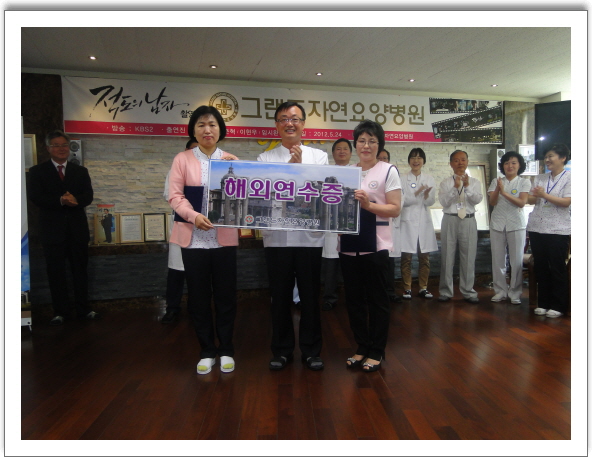 그랜드자연요양병원은 지난 6.1일 월례회를 통해 전반기 우수직원에 대한 시상식을 가졌다. 이 날 수상자는 2병동의 서진숙 간호조무사와 1병동의 정춘옥 요양보호사가 각각 수상하였다. 수상자들은 10월 후반기 우수직원들과 함께 3박4일의 일정으로 해외연수에 참여하게 된다. 나용승 병원장은 병원의 좋은 전통과 역사에 함께하게 되어 기쁘다며 여러분 모두가 주인공이 될 수 있다며 수상자들과 임직원들을 격려하였다.