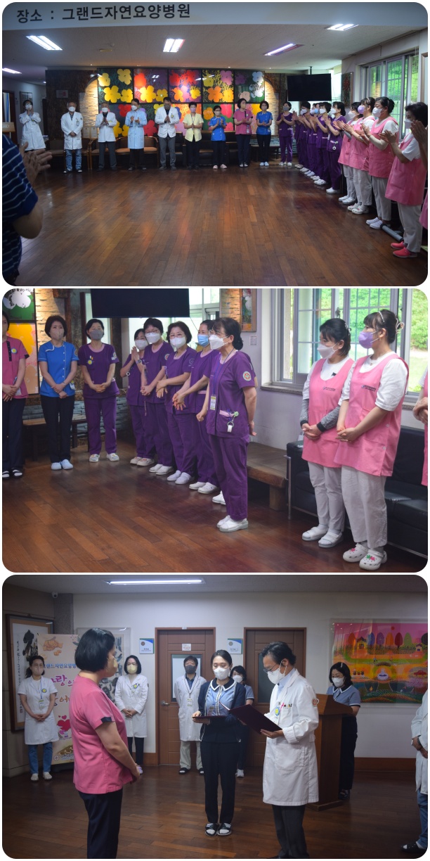 그랜드자연요양병원은 6월 3일 1층 로비에서 전직원들이 참석한 가운데 그랜드자연 월례회를 가졌다. 이재일 병원장은 날씨가 더워짐에 있어 어르신들과 직원들의 건강 관리에 만전을 기하자고 강조하였으며, 이어서 신입직원들의 인사가 이어졌고 QPS위원회 위원과 감염관리위원회 위원의 새로이 임명되는 위원에 대한 임명장을 수여하였다.