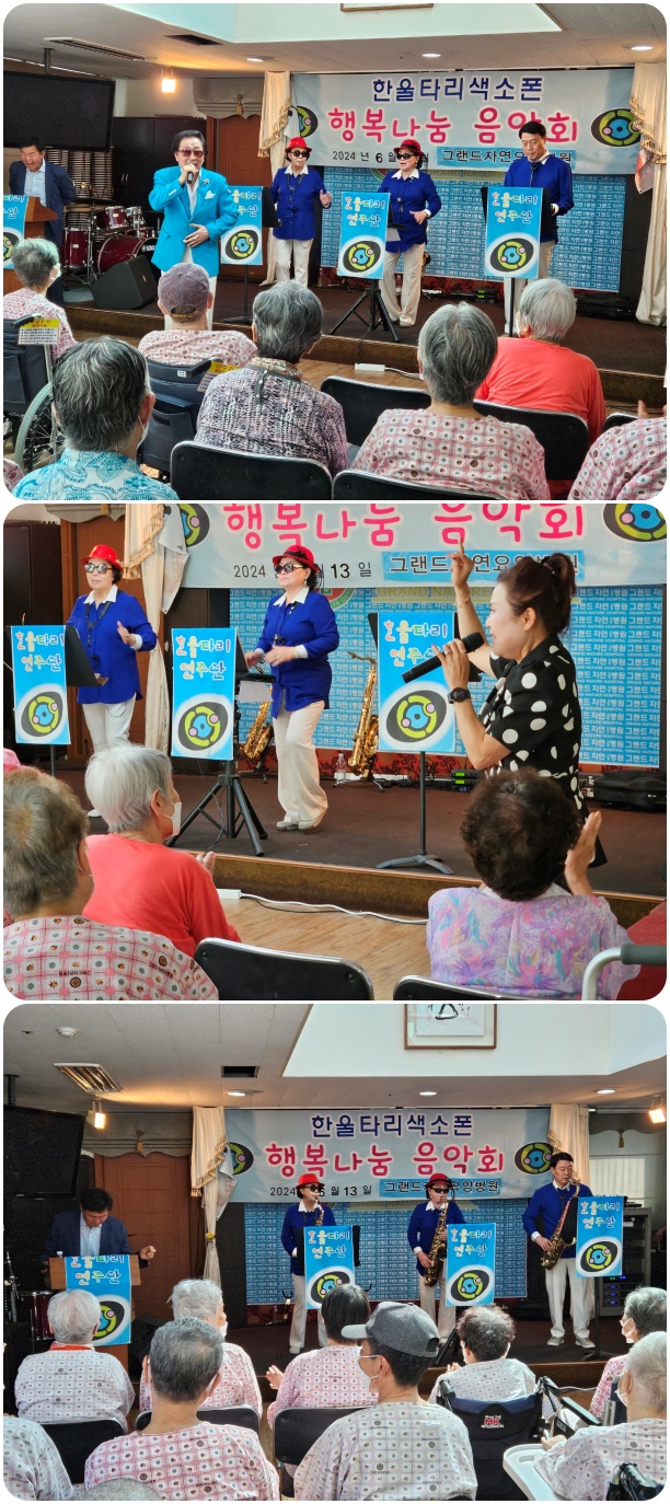 그랜드자연요양병원은 6월 13일 한울타리 색소폰의 <행복 나눔>공연으로 작은 음악회를 열었다. 이날 공연은 당신이 좋아, 찔레꽃 등의 색소폰 연주와 비내리는 고모령, 부산 아가씨 등의 옛가요로 어르신들과 함께 즐거운 시간을 마련했다.