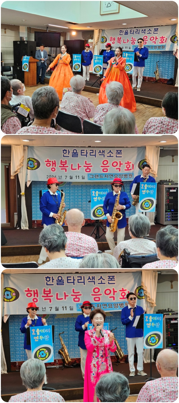 그랜드자연요양병원은 7월 11일 한울타리 색소폰의 <행복 나눔>공연으로 작은 음악회를 열었다. 이날 공연은 <해운대 엘레지>, <찔레꽃> 등의 색소폰 연주와 <동백 아가씨>, <부초같은 인생> 등의 옛가요로 어르신들과 함께 즐거운 시간을 마련했다.