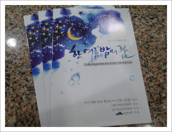 그랜드자연요양병원은 오는 8.25일 남구문화원과 함께 "한 여름밤의 꿈"이라는 주제로 아래와 같이 음악회를 가진다.이 번 음악회는 남구문화원이 만들어가는 찾아가는 문화행사의 6번째 마당으로 부산 남구지역 곳곳에 문화의 향기를 전파하고자 만들어진 행사로 특히,이번 6번째 마당은 그랜드자연요양병원의 환우들과 환우가족들을 위안하고,인근 대연지역 주민들과 함께 어우러지는 프로그램으로 준비되어지고 있다. [아래] 일정:2011.8.25(목)19:00-20:30 장소:그랜드자연요양병원 파이에온 잔디광장 [출연진] -국제고등학교AVEC합주단(오민성/박서연/김주희/배상일/김수빈/강채영) -그랜드자연합창단(지휘:윤명숙) -닥터스 색소폰(나용승 병원장/손신 부원장/박정식 진료과장) -한국무용의 세계(조복희외 4명) -오카리나 공연단(이귀숙 외 6명) -어쿠스틱 혼성듀오 POKO LAMBRO -재즈밴드 크로스노트(김은섭.심규성.권훈.서진석.김수지나) [함께합니다] -주최:부산남구문화원 -후원:부산광역시 남구청 -협찬:농협목우촌 또래오래 부산.경남지사