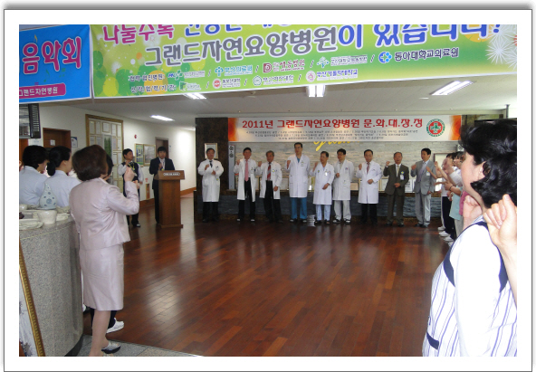 [그랜드 그랜드 힘!] 지난 5.2일 그랜드자연요양병원은 로비에서 임직원들이 참석한 가운데 5월 월례회를 가졌다.이 날 나용승 병원장은 영산홍이 가득한 가정의 달 5월을 맞이하여 병원의 시가람낭송회의 시낭송회를 시작으로 진행되는 병원의 크고 작은 행사에 직원들의 관심과 참여로 환우들의 입가에 한 번 더 미소가 지어 지는 5월을 만들자며 인사에 대신하였다.신입직원들의 파랑새 첫인사는 김옥자,김은하 간호사,최영미 간호조무사가 각각 인사하였다.특히,김옥자 간호사의 "열심히 하겠습니다"라는 짧은 인사는 큰 박수를 받았다. 그랜드자연요양병원은 5월을 맞이하여 5.14일에는 부산 남구소년.소녀합창단의 특별공연과 오는 5.11일 부산여성회관과 여성친화기업 협약식을 진행하며 5.17일에는 성희롱예방교육이 직원들을 대상으로 실시 될 예정이다.그랜드자연정기음악회는 5.26일 저녁7시 부산악기교실의 무대로 꾸며질 예정이다. [행사사진]