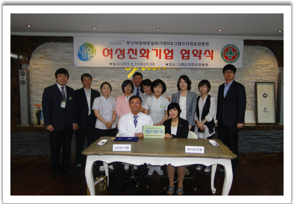 지난 5.11일 부산광역시 여성회관(관장 서혜숙) 부산여성새로일하기센터와 그랜드자연요양병원(병원장 나용승)은 여성친화기업 협약식을 가졌다.이 날 협약식은 병원에서 근무하는 여성들이 자신의 잠재력을 마음껏 펼칠 수 있도록 여성 인력을 적극적으로 지원하고,여성근로자가 일하기 좋은 일터를 만들기 위하여 상호 협약식을 가졌다.특히,여성가족부와 고용노동부지정 부산여성새로일하기센터는 모성보호와 일.가정의 양립이 가능하도록 적극적으로 사업을 전개하고 있다.