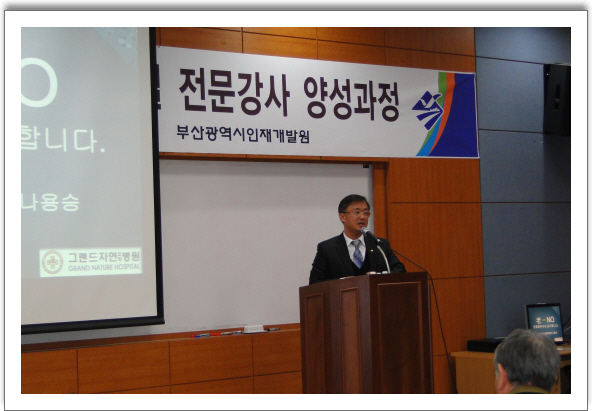 지난 4.19일 부산인재개발원에서 2011년 노인교실 전문강사 양성과정 교육이 양일간의 일정으로 진행되었다. 이 날 교육은 1일차에 노년기의 특징(강의:그랜드자연요양병원장 나용승)에 대하여 이어서 2층강당에서 국악공연이 있었고 노인학습능력과 교육방법(강의:부산시 건강가정지원센터장 한동희)순으로 진행되었다. 2일차에는 ICE BREAKING 기법과 성공이라는 주제로 이부승 도날드 비젼 코칭연구소장의 강의가 이어졌고 이어 심도있는 분임토의 및 발표로 교육을 종료하였다.