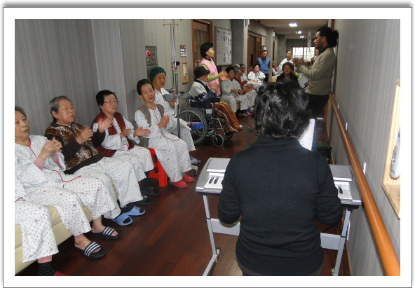 그랜드자연요양병원은 지난 12.1일(매주 수요일 오후)윤명숙의 찾아가는 음악치료 테라피 시간을 가진다.오늘도 각층별로 찾아가며 흥겨운 노래와 정다운 이야기가 어우러진다. 찾아가는 음악교실은 와상환자와 휠체어 사용으로 전체가 모여서 하는 집단활동에서 소외된 어르신들에게 좀 더 다가가는 그랜드자연요양병원의 녹색프로그램중 하나이다. 찾아가는 음악교실은 고신대학교 유학생으로 있는 소코(국적:피지)군이 참여하여 음악봉사활동을 도와주고 있다. [그랜드자연 홀웨이음악회]