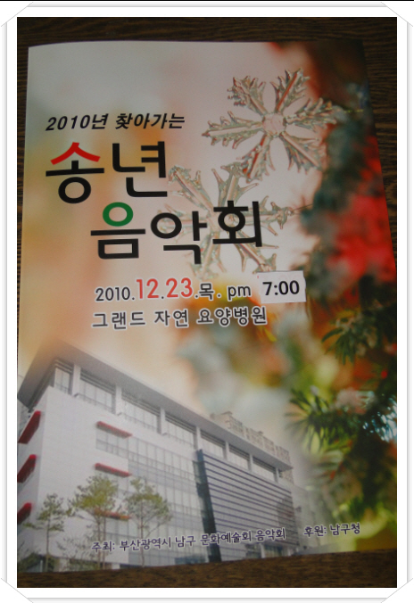 그랜드자연요양병원은 부산 남구문화회 음악회를 초청하여 제38회 그랜드자연음악회를 가진다. 이번 음악회는 오는 23일 목요일 오후7시 그랜드자연요양병원 5층 이벤트홀에서 2010년 송년 찾아가는 송년음악회로 진행된다.이날 음악회에는 병상에서 크리스마스와 송년을 맞는 환우와 그 가족들도 초대된다.특히,이 번 음악회는 트리오로 구성된 닥터 색소폰(나용승 병원장,손신 진료부장,박정식 진료과장)의 크리스마스 캐롤곡으로 Feliz Navidad와 창 밖을 보라가 협연으로 연주 될 예정이다. [공연안내] -일정:2010.12.23(목)저녁7시 -장소:그랜드자연요양병원 5F 이벤트룸 [출연진] -병원측 출연진 닥터 색소폰 협연(나용승 병원장/손신 진료부장/박정식 진료과장)