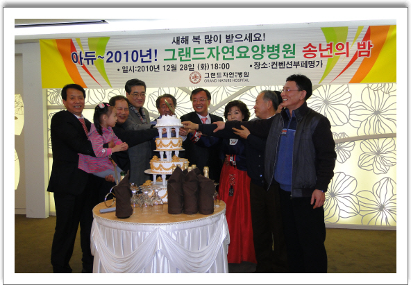 그랜드자연요양병원은 지난 12.28일 컨벤션뷔페명가에서 아듀~2010년 송년의 밤 행사를 가졌다.행사는 1부 식사,2부 어울림 한마당으로 나누어 진행되었다. 이 날 행사장에는 평소 병원에 내원한 자원봉사자들도 초청되어 올 한해를 되돌아 보는 시간을 가졌다.특히,2부 행사에는 올해를 마감하는 추억 영상 시청에 이어서 각부서별 준비된 프로그램을 진행하였다.초청된 윤석환 교수의 즉흥 시낭송과 김종곤씨 부부의 열창도 빼놓을수가 없었다.올해의 그랑프리는 2층간호사실에서 거머쥐었고 아쉽게 원무/행정팀은 2위에 "그랜드남정네들"이란 프로그램을 준비한 1층간호사실은 재활치료센터팀과 함께 공동3위를 차지하였다. 나용승 병원장은 모두가 참여하여 만들어간 오늘 송년의 밤에서 그랜드의 저력을 느낄수 있다면서 직원들의 지난 한해간 노고를 치하하며" 사랑합니다"라는 말을 끝으로 송년사를 대신하였다.