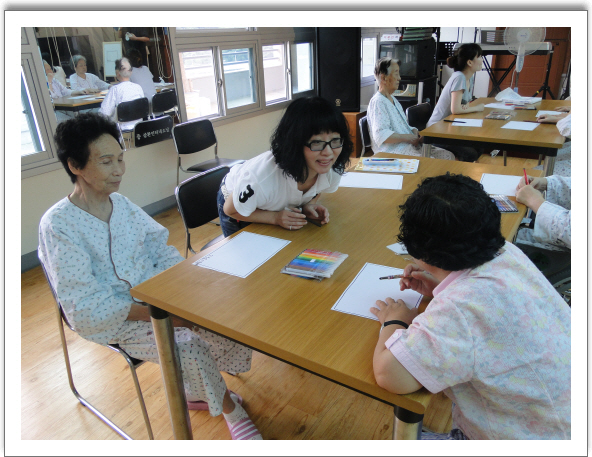 그랜드자연요양병원은 지난 9.14일 부터 미술치료 프로그램을 신설 하였다.미술은 자신의 마음을 정확하게 표현하는 수단으로 특히,치매노인이나 장기 입원 환자에게 심리적인 안정을 주는데 적합한 치료중 하나다.늘 불안정 할때가 많은 노인들은 스스로의 감정과 사고가 고스란히 담긴 자신의 그림을 보며 객관적으로 자아를 바라볼수 있게 된다.노인들의 닫힌 마음,숨겨온 감정,특정한 속성,가족의 생활환경 등이 그림에 나타나니 치료자는 환자의 마음을 이해하기 쉬워진다.미술 치료를 위해 사용되어지는 각종기구들을 만지는 촉감이 손끝운동으로 전달되어 뇌의 신경세포를 자극하고 발달 시키기도 한다.이런 전반적인 활동을 통해 15주 프로그램으로 꾸며져 동명대학교 외래교수인 윤석환씨와 문화생들의 도움으로 진행 된다. [실버테라피로 되찾은 생의 활력 프로그램] 미술치료는 매주 화요일 15:00에 진행됩니다.