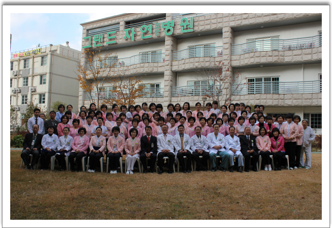 그랜드자연요양병원은 11.19일 개원3주년을 맞아 개원기념행사를 가졌다. 행사는 우수직원에 대한 시상식에 이어서 축하 시루떡 절단,병원장 기념사,전직원 기념촬영순으로 진행되었다. 최우수직원은 각분야별 우수자로 행정.관리부문에 나용운,간호부문에 정은희팀장,간병부문에는 김효숙간병사가 선정되었으며 부상으로 일본해외연수증이 전원수여되었다. 우수직원으로는 최성미 영양사,최미애 조리사,김화자 간호조무사가 각각 선정되었다. 이 날 나용승병원장은 기념사에서 지난 3년의 시간을 같이한 임직원들의 노고를 치하하고 고객만족을 위해 항상 움직이고 생각하는 자세와 마음을 갖는 하루가 되자며 강조하였다. 기념행사에 이어서 제2회 그랜드자연 도자기 전시회가 1층로비에서 열렸다. [행사사진]