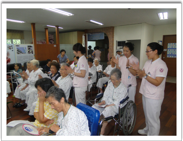 본원은 지난 9.1(수) 2층 문화홀에서 웃음치료 테라피를 가졌다. 이 날은 특별히 부산가톨릭대학교 간호학과생들이 함께 하였다.참여한 환우와 그랜드가족은 다양한 박수와 가위바위보 게임,따라부르기등의 웃음치료의 시간을 가졌으며 말미에 간호학과생과의 함께 노래하는 레크레이션도 가졌다.