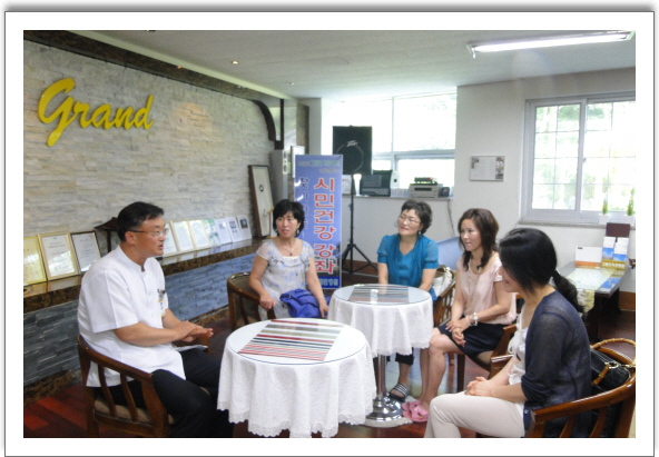 지난 7.22일 YWCA자원봉사단이 본원을 방문 하였다. 봉사자들은 나용승 병원장과 웃음치료 자원봉사에 대해 환담을 나누고 말미에 웃음치료에 동참하여 환우들과 즐거운 시간을 가졌다..향후 YWCA자원봉사단은 매주 우리병원을 찾아 마술과 요가와 흥겨운 노래방등 다양한 볼거리와 참여의 場을 사회복지사와 함게 꾸밀 예정이다.본원은 다양한 프로그램 개발을 위해 오늘도 최선을 다하고 있다.