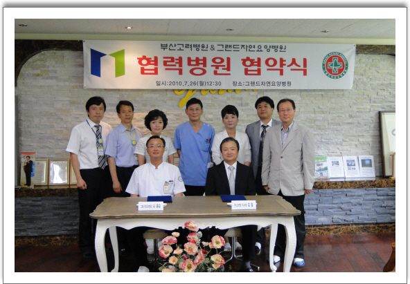 지난 7.26일 본원은 부산고려병원과 협력병원 협약식을 가졌다.이 날 양병원은 상호 진료협력을 통하여 양질의 의료서비스를 창출하고 국민보건복지향상과 지역사회 발전에 기여코져 체계적인 진료시스템 구축 및 협진의 활성화,의료시설의 공동이용,환자 이송,진료결과 회신등 환자 관리를 위하 제반 활동을 협조 하였다.이철 이사장(부산고려병원)은 정형외과만 보더라도 환자의 분포도가 최근 10여년사이에 고령인구쪽으로 바뀌었다며 양질의 요양병원이 부산 남구지역에 같이 위치하게 된것을 기쁘게 생각한다며 축사에 대신하였고 나용승 병원장(그랜드자연요양병원장)은 부산 남구지역의 의료서비스 부문에서 정형외과와 내과쪽의 질적 향상에 중추적인 역활을 담당하는 부산고려병원과의 협약식은 좋은 동반자 관계로 유지 될것이라고 밝혔다.한편 이날 참석자는 나용승 그랜드자연요양병원장,김철 부산고려병원 이사장을 비롯 부산고려병원측에서는 김소양 행정원장,이숙희 간호부장,신형식 원무차장등이 그랜드자연요양병원측에서는 손신진료부장,박순찬 행정부장,오미송 간호과장,이성준 기획조정실장 등이다.