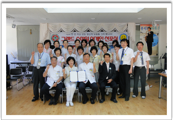 그랜드자연요양병원은 지난 6.8일 제7회GNH컨프런스 말미에 예쁜 스마일 버튼을 전직원이 부착하고 "그랜드 스마일 어게인 선포식'을 가졌다.이 선포식은 6월을 맞는 그랜드자연요양병원 가족들의 새로운 출발점으로 "환우들에게는 다시 미소를 찾을 수 있다는 희망의 멧세지와 임직원들은 "먼저 웃고 먼저 인사"하는 고객에 대한 작은 사랑의 출발점을 부여하기 위해서 라고 한다.선포식은 직원대표의 우리의 다짐 선서를 시작으로 힘찬 "그랜드"구호 제창과 기념촬영으로 마무리 하였다. [선서] 하나,우리 그랜드자연 가족은 환우와 보호자들이 다시 한 번 미소짓게 최고의 서비스를 제공한다. 하나,우리 그랜드자연 가족은 성실,노력,봉사의 원훈 아래 항상 먼저 웃고 먼저 인사한다. 하나,우리 그랜드자연 가족은 자연속 명품병원을 만드는데 최선을 다한다. 2010.6.8 선서자 대표