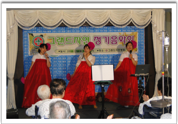 지난 6.24일 본원에서는 제32회 그랜드자연음악회를 가졌다.월드컵16강 진출을 기념하며 "오필승 코리아"를 합창하며 시작된 음악회는 축구선수 11명에 맞추어 11대의 색소폰이 초청되어 연주되는 흥겨운 시간을 가졌다. 해운대색소폰클럽의 이성호단장,황태성,임수진의 클라리넷과 색소폰의 너의 빈자리를 첫곡으로 색소폰 릴레이는 시작이 되었고 남자싱어와 함께 잠자는 공주,거짓말이 불러졌고 임수진씨의 색소폰독주도 이어졌다. 2번째 출연진은 뜸질자매로 재활치료센터에서 출연하여 어르신들의 뜨거운(?)갈채를 받았다.월드컵 열기를 담아 붉은색으로 무장한 뜸질자매는 그들만의 필살기를 유감없이 과시하고 무대를 마쳤다. 시몬음악실 색소폰 연주단과 동명색소폰 아카데미의 색소폰연주는 이른 여름밤의 분위기를 한껏 고조시켰다. 의료진의 6월연주는 나병원장의 모래시계와 우리마을,적과흑의 블루스,박과장의 무정블루스와 돌아가는 삼각지가 울려 퍼졌다. 지난 어르신노래자랑에서 1등을 차지한 구봉상어머니의 소양강처녀와 2층을 대표해서 노래하신 차종식 아버님의 해운대엘레지도 흥겨움을 더했다. 이렇게 모두가 하나되어 즐겨본 32회 그랜드자연음악회는 7월의 기약하며 막을 내렸다. [32회 음악회 이모저모]