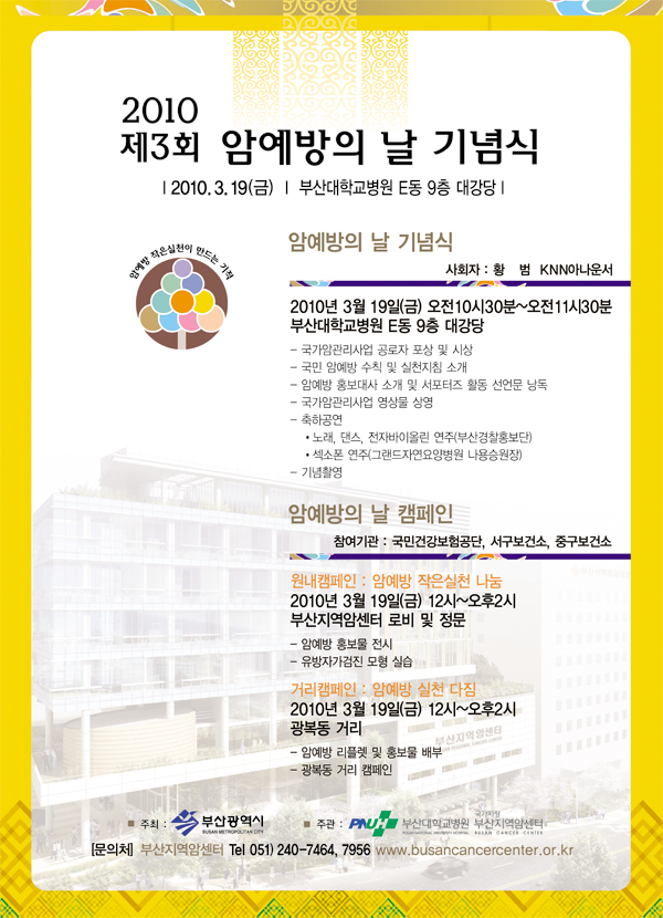 2010년 제 3회 암 예방의날 기념식 페이지 정보 작성자 그랜드자연병원 작성일10-03-20 14:54 조회3,227회 댓글0건 이전글 다음글 목록 본문 2010년 제 3회 암 예방의날 기념식포스터 입니다. 댓글목록 등록된 댓글이 없습니다. 이전글 다음글 목록