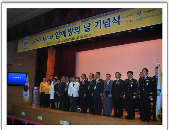 부산시는 제3회 암 예방의 날 기념행사를 19일 오전 10시30분 부산대학교병원 E동 대강당에서 보건소와 암 관련 단체, 암 예방 서포터즈 등 200여명이 참석한 가운데 KNN황범 아나운서의 사회로 진행되었다. 부산대학교병원 및 부산지역암센터가 주관한 이번 행사는 ‘국민 암 예방수칙’의 생활화를 통해 암은 예방 가능한 질환임을 알리고, 이의 실천을 통해 암 예방 효과를 극대화하기 위한 다양한 행사를 펼쳤다. 이날 기념행사는 유공자 표창, 암예방 홍보대사 김승환씨 소개, 국민 암예방 수칙 낭독, 조기 검진 문자보내기 이벤트, 암 예방 서포터즈 활동선언문 낭독, 암 관리 영상물 상영, 축하공연 등의 순으로 진행되었다. 이 날 참석자중 부산시 복지건강국장 배태수,부산대학교병원장 박남철,부산지역암센터소장 윤만수씨가 각각 기념사와 축사,환영사가 이어졌다. 특히,그랜드자연요양병원은 축하공연 무대에 부산경찰홍보단과 함께 나용승병원장의 색소폰연주도 더해져 암예방의 날 기념행사가 문화와 함께 어우러졌다.