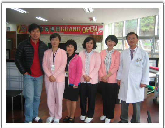 KNN 황범 앵커 내원 지난 3.22일 본원에 KNN 황범 앵커가 내원하여 환우들과 만남의 시간을 가졌다.황앵커는 병원 시설들을 둘러보고 재활운동센터에서 각종 재활기구들에 각별한 관심을 표했다.특히,3병동 김춘자(73)환우와 특별한 만남의 시간도 가졌다.빠른 시간내에 다시 자원봉사자로 방문하여 오늘 만난 여러 환우분들과 병원가족들과의 재회를 약속하였다. [사진:재활운동센터에서 포즈를 취하고 있는 그랜드자연가족 일동]