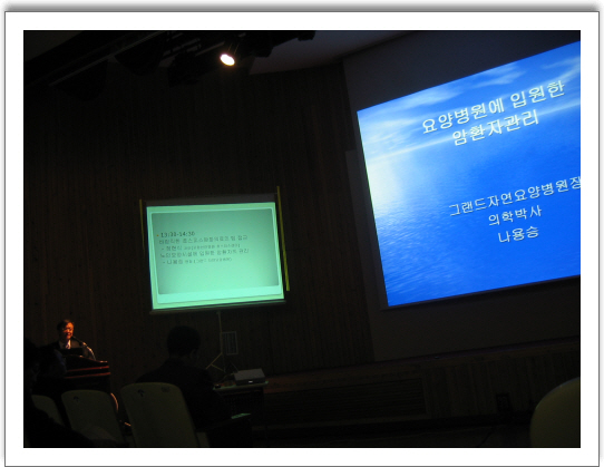 지난 4.10일 고신대학교복음병원 성산관에서는 2010년도 한국호스피스.완화의료학회 부산울산경남지회 춘계총회 및 학술대회가 열렸다.이 날 학회는 총3부로 나뉘어서 진행되었다.김호균 한국호스피스완화위원회 지회장의 개회사와 조성래 고신대복음병원장이 축사에 이어 제1부 연좌로 참석한 나용승 원장(그랜드자연요양병원)은 "노인요양시설에 입원한 암환자의 관리"라는 주제로 강의 질의 응답의 시간을 가졌다. [학회이모저모]