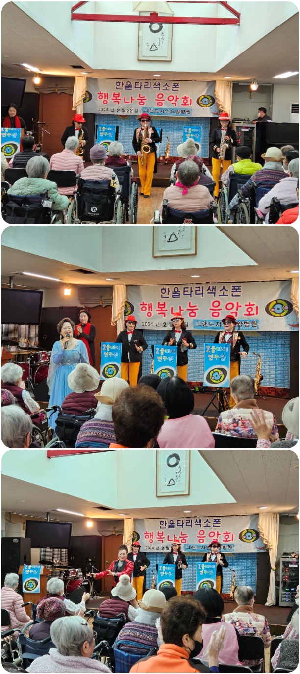 그랜드자연요양병원은 2월 22일 한울타리 색소폰의 <행복 나눔>공연으로 작은 음악회를 열었다. 이날 공연은 해운대 엘레지, 찔레꽃 등의 색소폰 연주와 동백 아가씨, 부초같은 인생 등의 옛가요로 어르신들과 함께 즐거운 시간을 마련했다.
