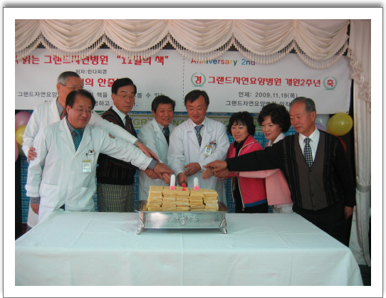 11.19(목)개원2주년을 맞은 그랜드자연요양병원은 로비에서 환우들과 직원들이 참석한 가운데 기념행사를 가졌다.이 날 개원행사에서 나병원장은 "그랜드자연요양병원의 긴여정 속에 임직원과 환우들이 같이 더불어 만들어 가는 오늘이야 말로 개인 개인에게 더욱 소중하다며 개원사를 대신하였다.중식시간에는 2주년 시루떡을 절단하고 참여한 모든 소중한 인연들과 음식을 나누었다.지난 10.16일 가졌던 도자기 체험활동 테라피에 참여하여 만든 도자기 작품이 도착하여 완성된 도자기 나눔의 행사도 가졌다.그랜드 자연 요양병원은 2주년의 방향을 재활의학,양.한방 보완통합의학 협진병원으로 방향타를 잡았다.