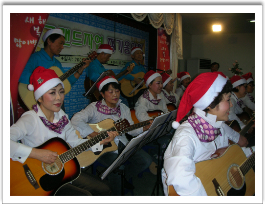 본원은 지난 12.23(수)제26회 그랜드자연음악회를 가졌다.이번 음악회에는 실버통기타앙상블의 캐롤이 있는 음악회를 테마로 무대가 펼쳐졌다.실버통기타앙상블의 흥겨운 크리스마스캐롤송을 시작으로 참여한 환우들과 그랜드자연가족들은 또 다른 크리스마스의 밤을 경험했다.앙상블 멤버중 벨리댄스 순서에 나선 방금연님의 엄청난 댄스실력에 모두가 즐거워했으며 까메오로 등장한 나유진양의 "소녀시대"의 노래에 모두의 어깨가 들썩거렸다.이번 음악회에는 크리스마스를 테마로 해서인지 붉은물결이 넘실거리는 힘찬 기운이 원내에 불었다.손희숙 환우의 신청곡을 연주한 나용승 병원장은 "연말 연시 이렇게 음악으로 하나 될 수 있는 원내의 모든분들에게 축복을 드리며 2010년 경인년을 기약하며" 송년인사를 대신하였고 음악회는 대단원의 막을 내렸다.