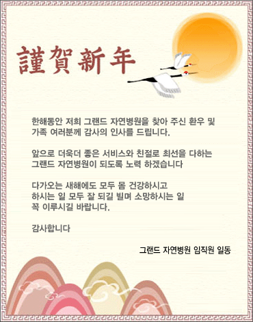 경인년 새해 복많이 받으세요! 페이지 정보 작성자 그랜드자연요양병원 작성일09-12-28 11:29 조회3,515회 댓글0건 이전글 다음글 목록 본문 지난해의 온정에 感謝드리며 새해에는 뜻하시는 일 모두 이루시고 健康과 행복이 함께 하시길 祈願합니다. 2010.1.1 본원은 신정에도 정상진료합니다. 댓글목록 등록된 댓글이 없습니다. 이전글 다음글 목록