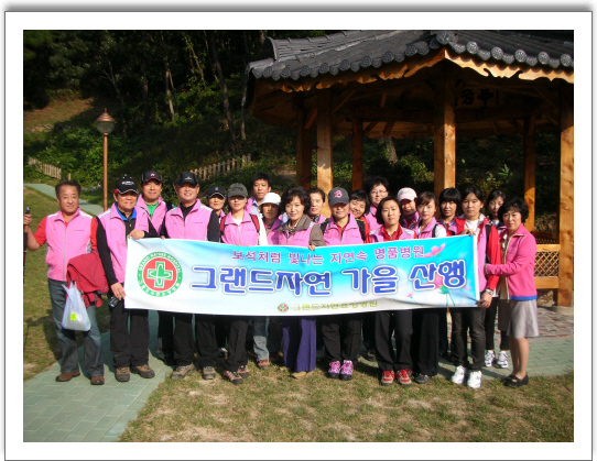 본원은 지난 10.24(토)2009년 그랜드자연가을산행을 임직원 20여명이 참석한 가운데 가졌다.이 날 산행은 올들어 2번째 산행으로 코스는 본원 해암정을 출발 황령산봉수대 경성대에 이르는 코스였다.그랜드자연人들은 출발전 단체사진을 찍고 출발을 알리는 "그랜드 그랜드 힘!"의 구호를 외치고 황령산(427m) 정상을 향해서 출발하였다. 자연스럽게 2개조로 나뉘어 산행이 진행되었다.A조는 원장님조,B조는 진료부장님조로 나뉘었다.각조는 황령산봉수대에서 만나기로 하고 이동하였다. 1차급수지점인 스노우캐슬에서 만난 앰블란스에 추억을 남기며 가을산행은 계속되었다. 황령산봉수대 부근에 도착하자 원장님표 석빙고를 하나씩 먹고 가을바람이라고 하기엔 조금 세찬 바람을 맞으며 갈증해소를 위해 오이를 나누어 먹었다. 이 후 일행들은 편백나무 숲을 지나 조별로 하산을 하였다. 이 후 코리안씨리즈 7차전이 막바지 무렵 해물전골로 저녁식사를 하였다. 산행을 마무리하며 간단한 시상과 추첨이 이어졌다. 이 날 베스트 드레서에는 유인주 물리치료팀장이, 경품으로 나온 고급 와인은 A,B조에서 각각 추첨을 통해 나누었다. 이 날 나용승병원장은 산행을 통해 자신의 건강을 채크하는 계기를 삼아 지속적인 걷기운동을 강조하였다. [산행포토] ▷해암정을 출발해 도착한 제1급수지:앰블란스 너 반갑다.