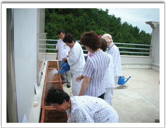 2009.8.31 원예치료 도구설치 2009.9.4 원예치료 1일차(초빙강사:박진모님) 그랜드자연요양병원은 옥상정원만들기 일환으로 옥상을 이용한 원예치료 기초프로그램을 만들어 운영하고 있다. 원예치료는 식물을 통한 원예활동에 의해서 사회적.교육적.심리적 혹은 신체적 적응력을 기르고 이로 말미암아 육체적 재활과 정신적 회복을 추구하는 전반적인 활동이다. 원예치료의 효과는 크게 4가지로 분류하는데 지적인효과,사회적인 효과,정서적인효과,신체적인효과를 들수 있다. 그중 그랜드자연요양병원에서는 기초적인 단계로 우선 환자들에게 신체적인 효과에 주안을 두고 프로그램을 운영중이다. [신체적인 효과] 1.균형감각을 유지한다. 2.시선에 따라서 손이 같이 움직일 수 있는 능력을 증가시킨다. 3.시네츨ㄹ 움직임으로 근력을 강화 시킨다. 4.관절이 움직일 수 있는 범위(ROM)를 자연스럽게 증가시킨다. 5.야외 작업이나 정원활동으로 운동량을 최대한 증가시켜 전신운동의 효과를 창출한다.