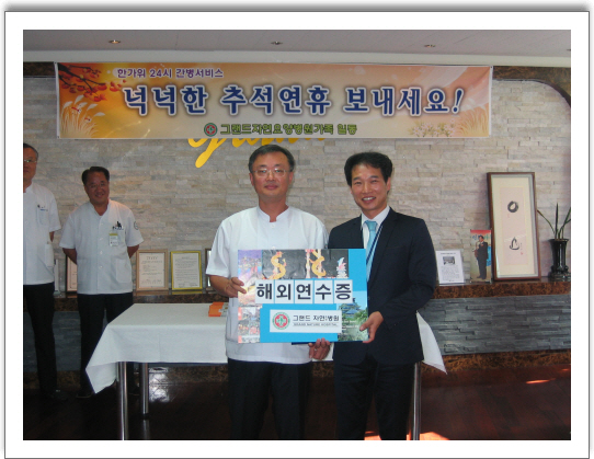 2009.10.1(목) am09:00 본원에서는 10월 월례회를 1층 로비에서 필수요원을 제외하고 전직원이 참석한 가운데 열렸다.오늘 월례회에서는 2009년 후반기우수사원 시상식과 적극적인 사원에 대한 시상 그리고 한가위의 精을 나누는 시간으로 진행되었다. 2009년 후반기 우수사원으로는 신용운 총무팀장이 상장과 부상으로 해외연수증을 나용승 병원장님으로 부터 수여 받았으며 적극적 사원상에는 정은희 팀장,김미란 선생님,노성욱 주임이 받았다. 새 그랜드자연가족 소개에는 육미경 원무과 직원이 새가족으로 출발을 알렸다.나용승 병원장은 추석명절에도 열심히 근무하는 의료인들이 있기에 환우와 가족들은 편안히 조상도 모시고 명절을 즐길수 있다며 근무자들의 노고를 치하하였다.