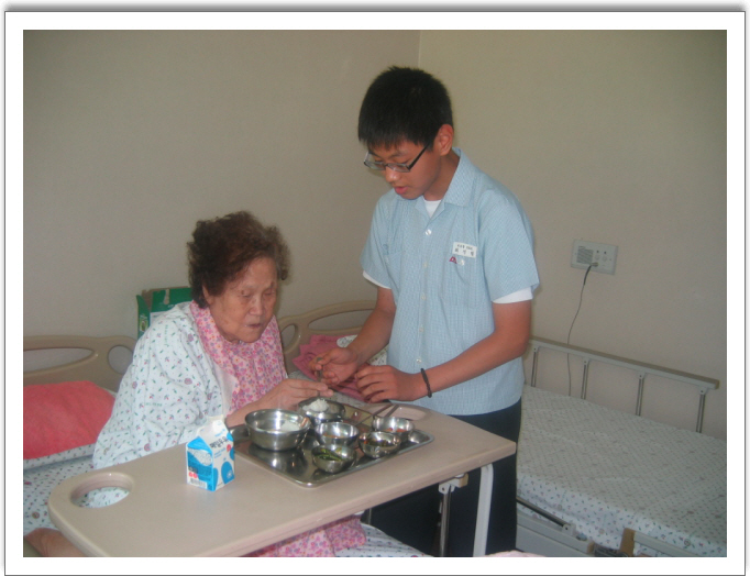 지난 7.5(토) 주말을 맞아 대천중학교 재학생들이 그랜드자연요양병원을 찾았다. 재학생들은 병원의 시설을 둘러보고 자원봉사 활동에 들어 갔다.봉사활동이 끝날무렵 점심시간에 맞추어 학생들은 노인병동에 들러 식사수발 자원봉사 활동을 가졌다. 어르신들에게 식사 수발을 거들은 학생들은 자원봉사를 마치고 "집에서는 생각지도 못하는 일인데 여기 병원에서 孝를 행하는 또하나의 방법을 습득했다" 면서 자원봉사 정신을 배울 수 있는 좋은 계기가 되었다면 가벼운 발걸음으로 병원을 나섰다. -자원봉사학교:대천중학교(부산 남구 대연동 소재)