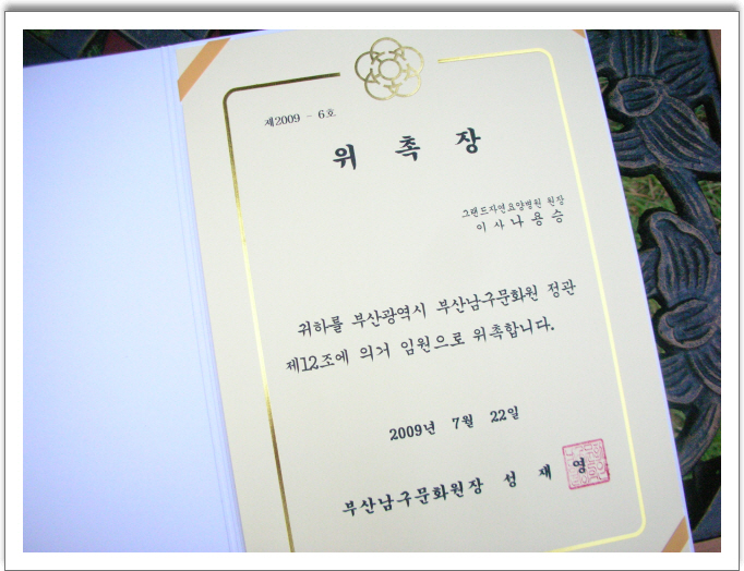 그랜드자연요양병원과 남구문화원의 긴밀한 관계유지를 위해 지난 7.22일 성재영 남구문화원장으로 부터 나용승병원장은 지역 이사로 위촉장을 수여받았다. 이로써,남구문화원과 본원 사이에 문화라는 새로운 징검다리를 놓은 계기가 마련되었으며 병원문화의 새로운 페러다임을 제시하고 있는 본원에 남구문화원이라는 든든한 지원세력이 늘 곁에 함께 하게되었습니다.
