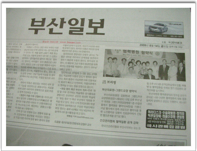 부산의료원-그랜드자연요양병원 협약식 부산의료원(원장 김동헌)과 그랜드자연요양병원(원장 나용승)는 12일 오후 부산 남구 대연동 그랜드자연요양병원 1층 리셉션룸에서 협력병원 협약식(사진)을 가졌다. 이날 행사에서 양측 의료진은 협약식을 통해 노인환자와 암환자 진료분야에서 긴밀한 협조 관계를 갖기로 했다. 출처:2009년8월14일자 부산일보 19면 편집:그랜드자연요양병원 기획실