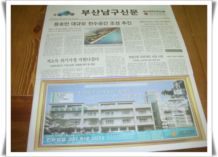 부산광역시 남구는 활기찬 도시 살기좋은 남구건설이라는 슬로건 아래 남구신문이라는 지역신문이 월1회 매월 25일을 전후해서 발간되어 지고 있다.이 번호의 주요기사는 남구드림스타트 개소,남구 명품 건강길을 걷다,아름드리 동백나무 기증,구민공원 새단장을 했다등 다양한 소식이 실려있으며 특히,구정소식난에는 본원이 지난 6월13일 참여하였던 남구 자원봉사 박람회 소식이 게재되기도 하였다.자원봉사자 박람회장에는 남구보건소와 건강검진센터,그랜드자연병원이 합동으로 무료진료 활동을 펼쳤고 혈압 및 혈당체크,체지방 체크등 행사장을 찾은 지역주민과 자원봉사자들은 자신들의 건강을 체크해주는 부스앞에서 줄을 서서 기다리는등 큰 호응을 보여주었다. 그랜드자연요양병원은 남구신문 제161호(2009.6.25일자)에 8면에서 만나실수 있습니다. *본원행사참석자* 나용승 그랜드자연병원장,정주호 총괄조정국장외 2명,석송숙 간호과장,이영미간호사,김영주간호사
