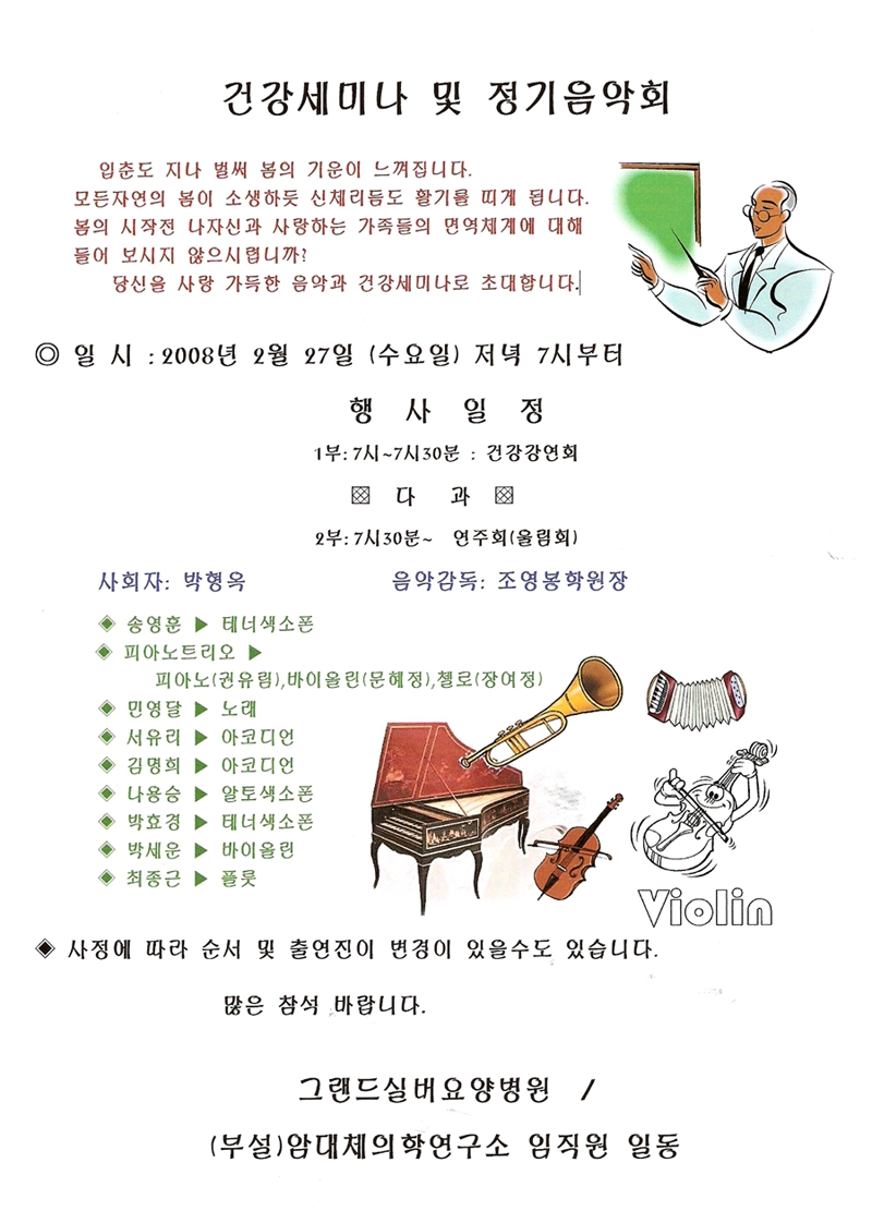 그랜드 정기 음악회 페이지 정보 작성자 그랜드병원 작성일08-02-13 18:16 조회3,409회 댓글0건 이전글 다음글 목록 본문 많은 참석 부탁드립니다.^^ 댓글목록 등록된 댓글이 없습니다. 이전글 다음글 목록