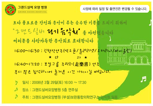 그랜드자연 정기음악회 페이지 정보 작성자 그랜드병원 작성일08-03-19 14:19 조회3,413회 댓글0건 이전글 다음글 목록 본문 그랜드 자연 정기음악회 댓글목록 등록된 댓글이 없습니다. 이전글 다음글 목록