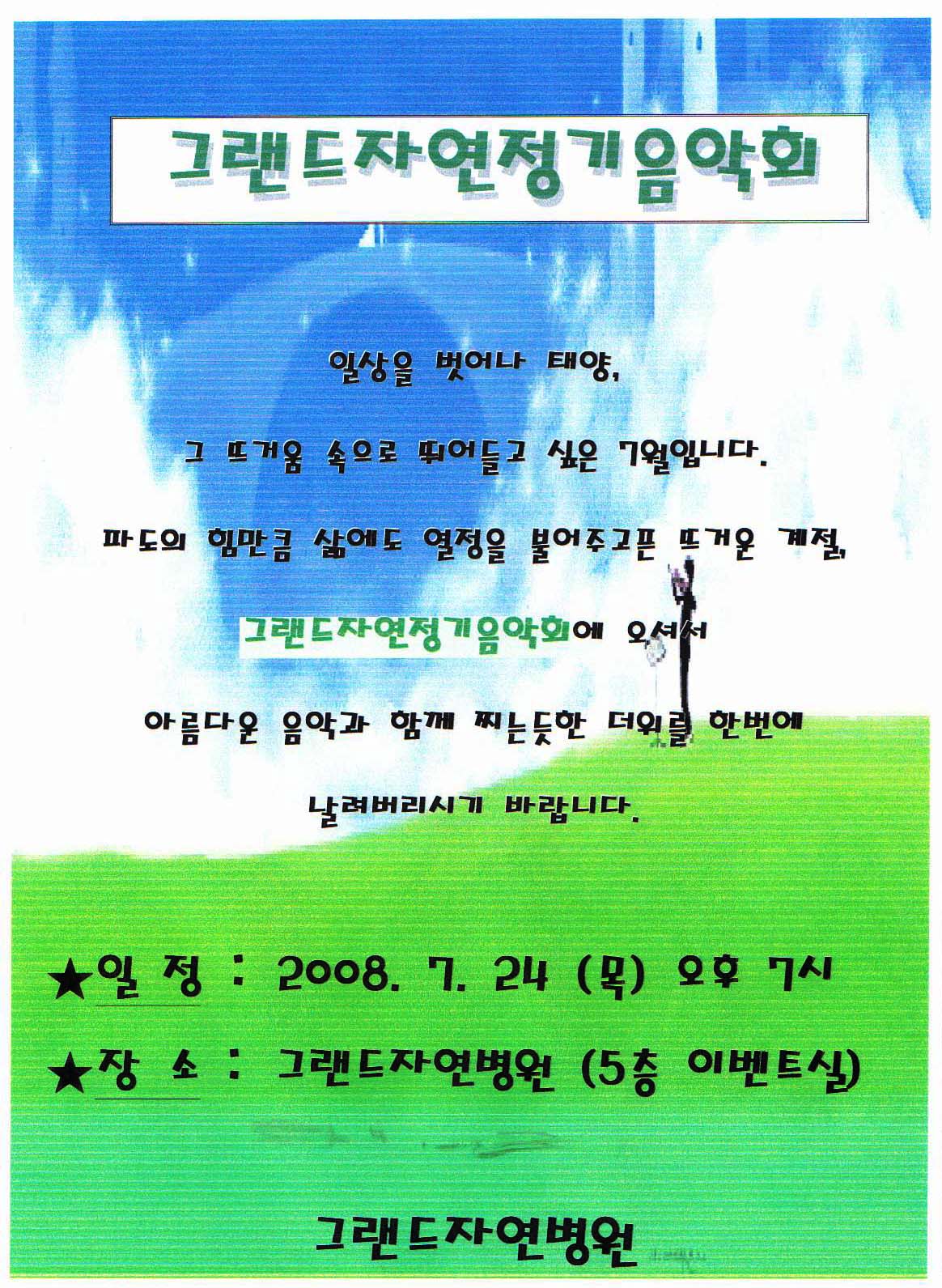 7월 그랜드정기음악회 페이지 정보 작성자 그랜드자연병원 작성일08-07-03 12:55 조회2,932회 댓글0건 이전글 다음글 목록 본문 .. 댓글목록 등록된 댓글이 없습니다. 이전글 다음글 목록