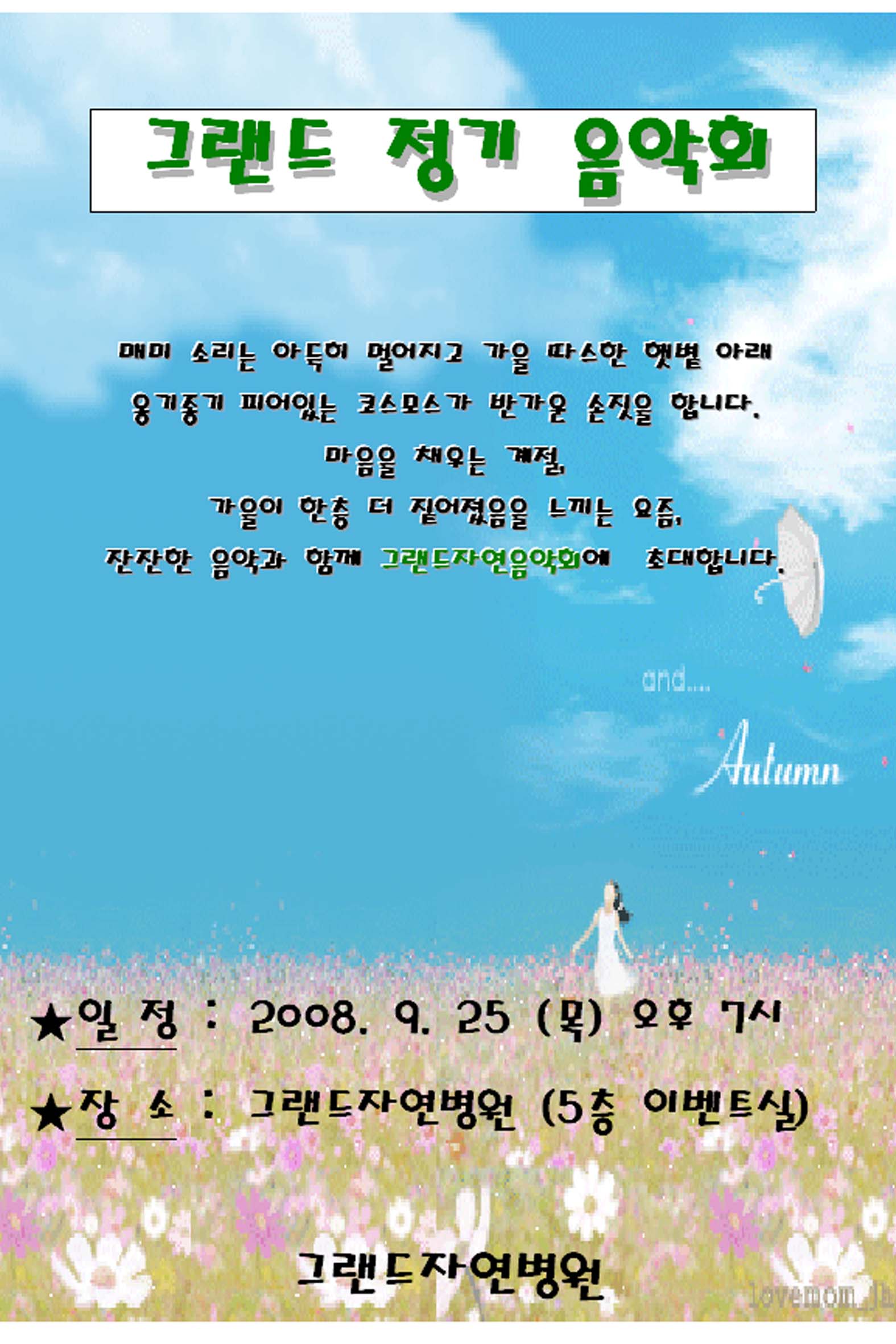 9월 그랜드자연정기음악회 페이지 정보 작성자 그랜드자연병원 작성일08-09-19 20:34 조회2,852회 댓글0건 이전글 다음글 목록 본문 .. 많은 참석 부탁드립니다^^ 댓글목록 등록된 댓글이 없습니다. 이전글 다음글 목록