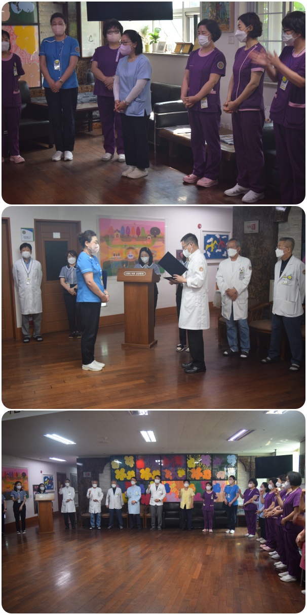 그랜드자연요양병원은 7월 3일 1층 로비에서 전직원들이 참석한 가운데 그랜드자연 월례회를 가졌다. 이재일 병원장은 날씨가 더워짐에 있어 어르신들의 음식물 관리와 건강관리에 더 각별한 주의를 당부하였으며 이어서 신입직원들의 인사가 이어졌고, QPS위원회 위원과 감염관리위원회 위원의 새로이 임명되는 위원에 대한 임명장을 수여하였다. 7월의 시작을 준비하는 마음으로 "그랜드 그랜드 힘!"의 구호와 함께 월례회를 마쳤다.