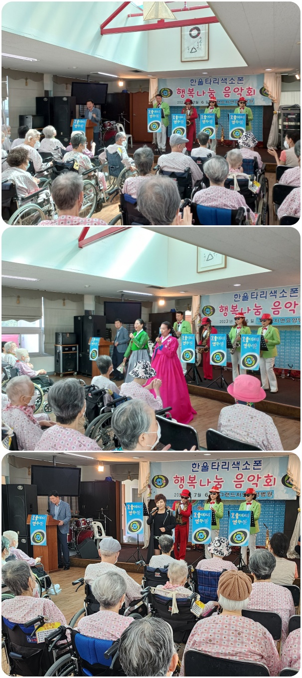 7월 6일 한울타리 연주단의 공연으로 그랜드자연요양병원 5층 이벤트홀에서 작은음악회가 열렸다. 한울타리 연주단은 <울어라 열풍아>, <창부타령>등 어르신들이 평소 즐겨 부르시는 옛가요와 민요를 비롯하여 색소폰 연주로 어르신들과 함께 흥겨운 시간을 마련했다.