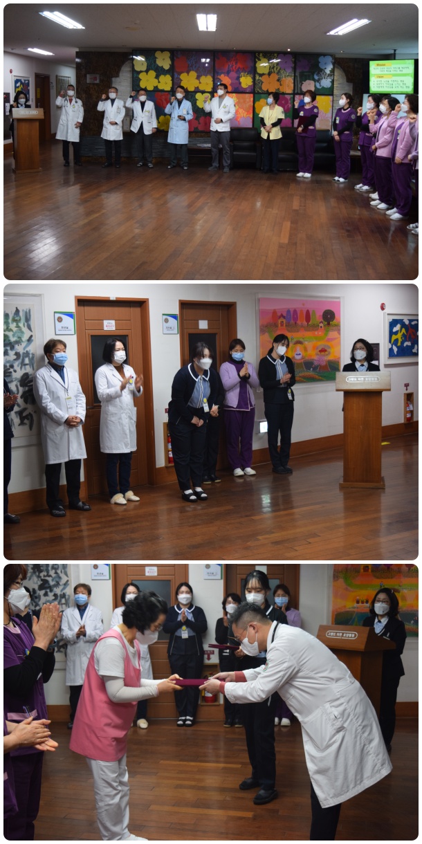 이재일 병원장의 2022년 임인년 "검은 호랑이의 해"를 맞아 새로운 시작으로 박차를 가하자는 새해 첫 인사 말씀과 이어 하필성 부원장의 새해 첫 말씀, 신입 직원들의 인사, 미용 봉사를 실천하고 있는 직원들에 대한 감사장 전달이 이어졌다.