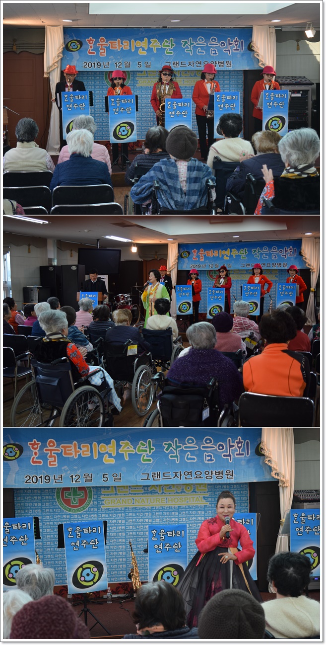 12월 5일 한울타리 연주단의 공연으로 그랜드자연요양병원 5층 이벤트홀에서 작은음악회가 열렸다. 한울타리 연주단은 <울어라 열풍아>, <창부타령>등 어르신들이 평소 즐겨 부르시는 옛가요와 민요를 비롯하여 색소폰 연주로 어르신들과 함께 흥겨운 시간을 마련했다.