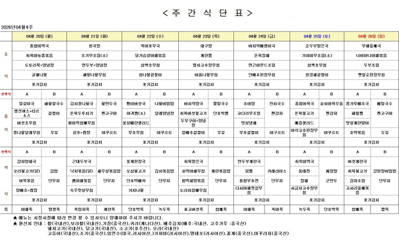 주간 식단표 (4월 4주) 페이지 정보 작성자 최고관리자 작성일26-04-17 10:24 조회70회 댓글0건 이전글 다음글 목록 본문 주간 식단표 (4월 4주) 댓글목록 등록된 댓글이 없습니다. 이전글 다음글 목록