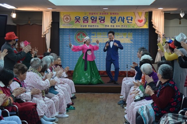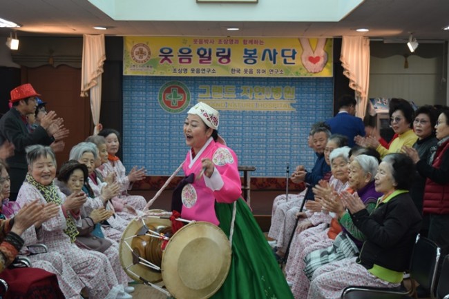 그랜드자연요양병원은 우리 어르신들이 보다 나은 병상생활을 통해 건강해지기 위한 특화 프로그램으로 웃음박사 조상영 교수를 모셔 즐거운 웃음요법을 하고 있다.