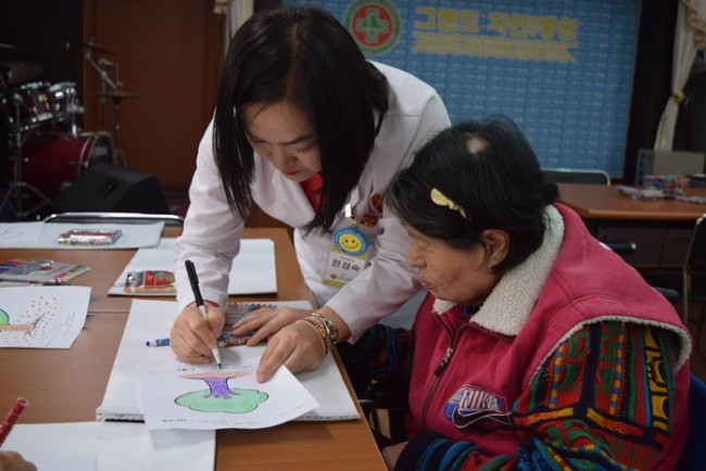 그랜드자연요양병원에서 활용하고 있는 어르신들을 위한 인지재활 특화프로그램 중 미술요법은 그림으로 어르신들의 마음을 읽는다. <나의 나무 꾸미기>는 무의식 자아에서 시간적 범위를 인식하며 자아 존중감 향상에 도움을 준다.